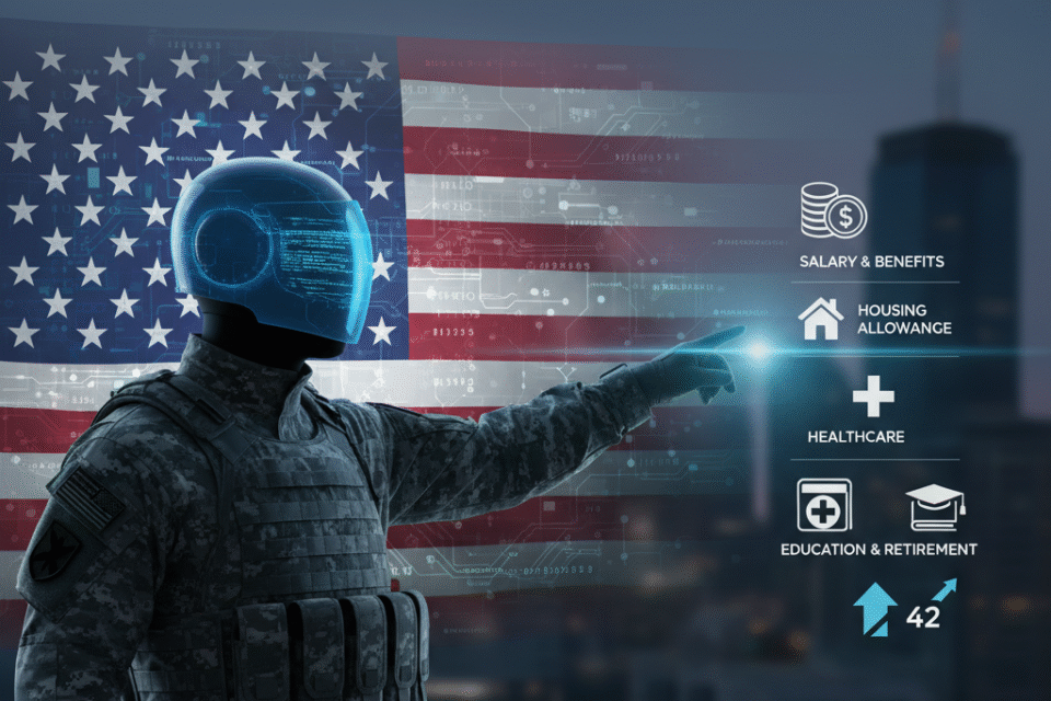 Quân đội Mỹ cung cấp nhiều phúc lợi, trong đó chủ yếu bao gồm – Trợ cấp nhà ở miễn thuế (BAH), bảo hiểm y tế miễn phí, hỗ trợ giáo dục GI Bill và chế độ hưu trí cho những người phục vụ đủ thời gian quy định.